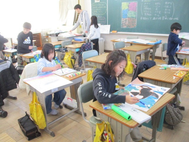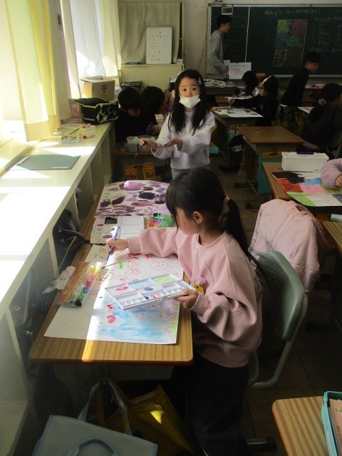 クレパスで絵を描いて、その上に絵の具を塗ってもクレパスが水をはじくのでクレパスの線は残ります。その性質を利用して、今までに使った技法も使いながら絵を描いています。なんか、みんな芸術家みたいでしょう。