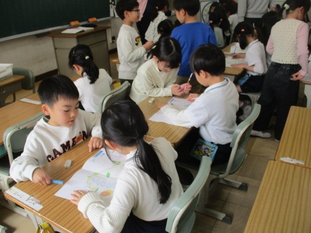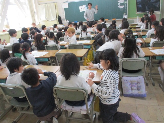 1年生が、丁寧に鉛筆の持ち方と書き方を教えてくれました。すっごく優しく丁寧に教えていましたよ。