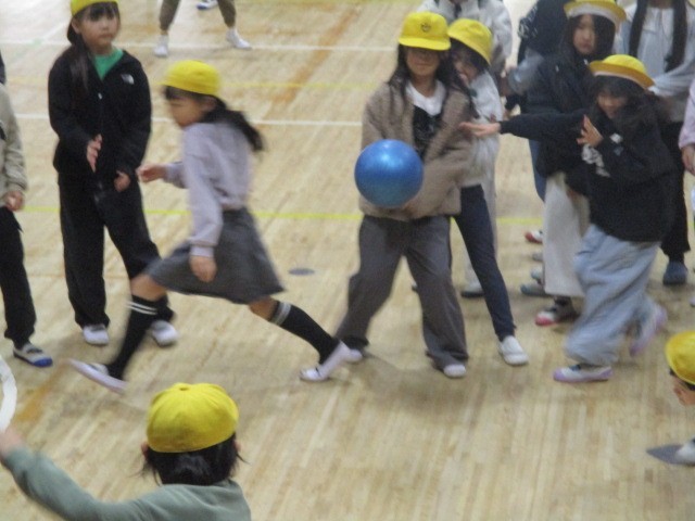 縦からでも横からでも投げられるドッジボールです。学年全員でやっているので、どこに投げても当たりそうなものですが、そうでもないようです。