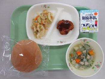 今日のメニューは、牛乳、セルフカツバーガー、株のスープ煮、ツナのソテー。