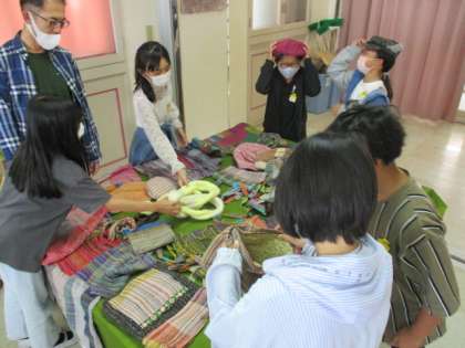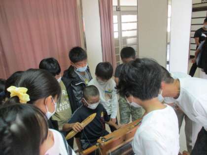 風媒花さんは、中央小学校と16年前から交流しているそうです。それ以前から、ボランティアクラブとの交流とかはあったそうで、それも含めるともっと前から交流していたということです。特に、地域活動支援センターまつばらは田井城にあるので、子どもたちも「知ってる!」と言っていました。そこでの、仕事の話とかを聞きながら、風媒花さんが作っている野菜やさおりおり、ブレスレットやネックレスなどを見せてもらったり、さおりおり体験をさせてもらったりして、楽しいひと時を過ごしました。