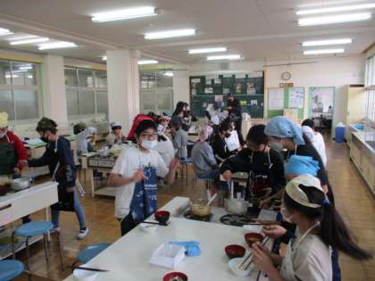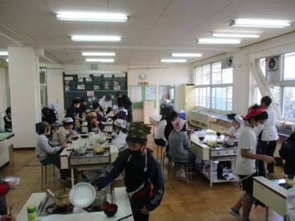 ごはんは炊飯器、だしはパックのだしの家庭がほとんどの中、今日の調理実習は、お鍋でご飯を炊くことと煮干しからしっかりだしをとった味噌汁づくりをしました。お鍋のご飯は、おこげもおいしい!だしからとったみそ汁はめっちゃおいしい!