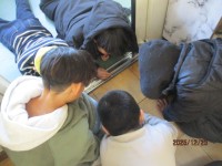 防災講話を聞いています。フードドライブは随時受け付けていますのでよろしくお願いします。