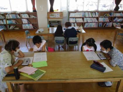 まだまだ暑い日が続きますが、体育館で「ドッジボール」、運動場で「紙飛行機」、図書室で「詩吟」をしました。