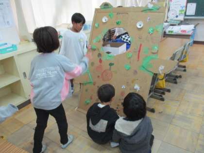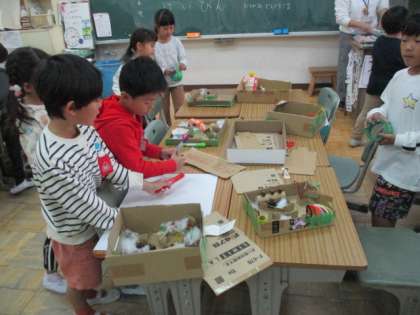 1年生では、まつぼっくりやどんぐりを使って、カリーノ保育園の子どもたちに楽しんでもらおうと「あきまつり」に取り組んでいます。今日は、サポーターの方にも来ていただいて、どんぐりに穴をあけてもらったり、工作を手伝ってもらったりしました。