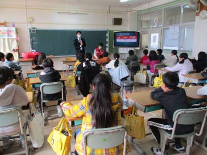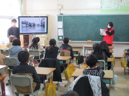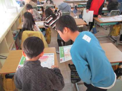 今日は、市役所危機管理課の人たちに来ていただいて、地震と洪水のことを考えました。南海トラフ地震が起こったとしたら、すべての家庭の生活用水が使えなくなること、松原市はまちの安全対策としてセーフコミュニティーに取り組んでいることや警戒レベルの話も聞きました。また、昔松原市では洪水がたびたび起こっていたことと、洪水の危険個所を示すハザードマップを用いて自分たちが住んでいるところが安全かどうかを調べました。