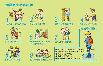本校では、1.17の阪神淡路大震災に近い日に地震避難訓練を実施しています。今日は、みんな迅速に行動して、避難指示があって校庭に集合するまで4分かかりませんでした。松原市のHPに「地震発生時の心得」がありましたので掲載します。