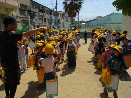 2年生は、2日間に分けて校区探検をします。今日は、市民プール、まつばらテラス、中央公園から文化会館に行き読書の森を通り、市役所と消防署を通って田坐神社に行き、学校に戻るコースです。