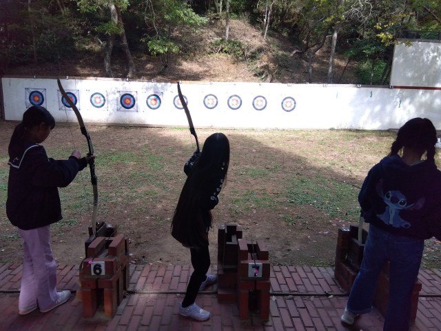アーチェリーのグループはアッという間に上達し、的の真ん中に当てることができる人も...