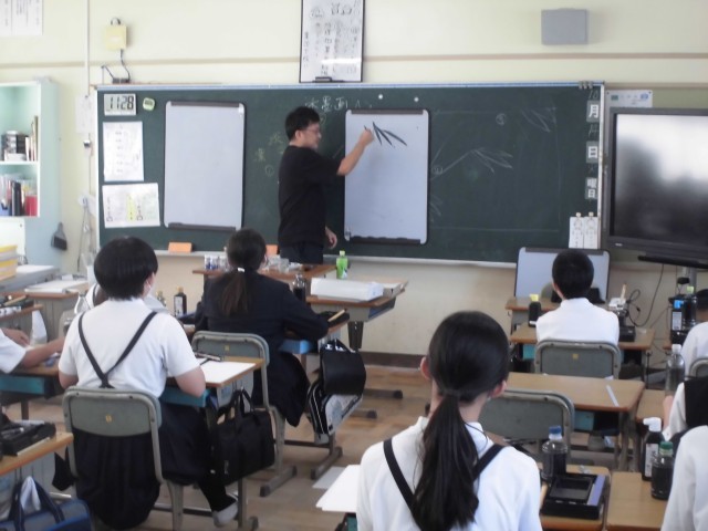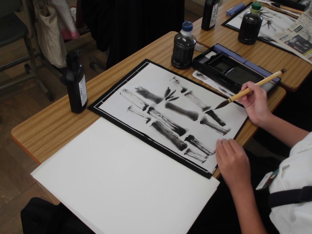 今回の図工は、奈良芸術短期大学の先生を招いて、水墨画の描き方を学びました。