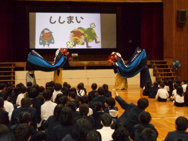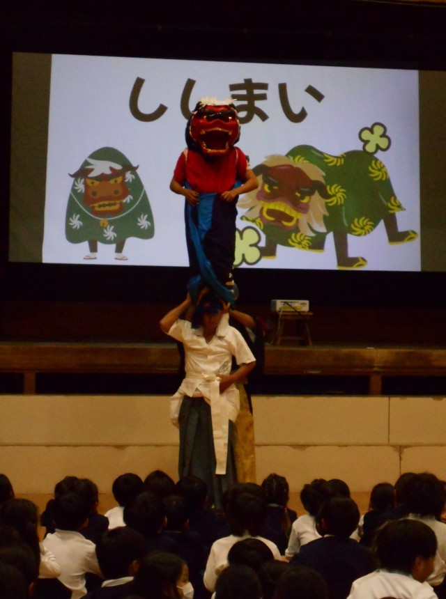 天美北小学校の50周年を祝して、本日感謝の会を行いました。天美北小学校歴史クイズや、学校の取り組みについての発表のあと、スペシャルゲスト獅子舞の披露もありました。記念品のトートバックとクリアファイルを児童が持ち帰っていますので、お家でも見てあげてください。