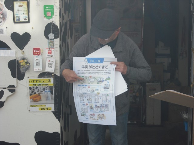 明治牛乳さんの見学をしました。朝は3時から仕事を始められ、11時ごろまで配達の仕事をされています。各家庭や幼稚園、老人ホームなどにも配達されているそうです。一番売れている乳飲料はヨーグルトだそうです。昼からは、自分で作ったカステラを売られています。冷蔵庫も見せていただきました。仕事の苦労や喜びなど、子どもさんに聞いてあげてください。