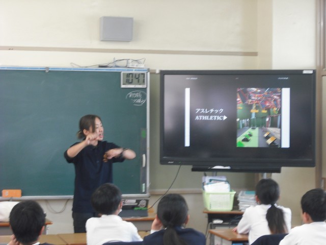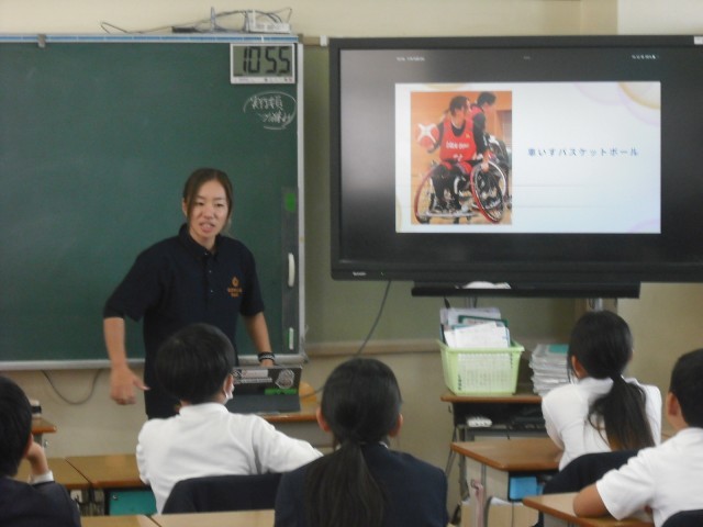 パラスポーツを楽しもう!というテーマで、校区にあるゴリラパークから西村圭子さんに来ていただいて、パラスポーツについて聞き取りをしました。西村さん自身、バスケット・ボクシング・トライアスロンなど様々なスポーツに挑戦されています。その豊富な体験に子どもたちも話に引き込まれていきました。西村さんは現在、ゴリラパークでお仕事をしながら、パラクライミングの選手の目となってガイドをされるサイトガイドとして活躍されています。選手とはトランシーバーで、時計の方向で指示を出されています。先日は国内の大会でサイトガイドで支援をしている選手が優勝したそうです。昨年度は、フランス・韓国・アメリカにも行かれたそうです。アイマスクを持ってきていただいたので、子どもたちが二人一組になって、マスクをした人がカードを合わせるサイトガイドの体験をさせてもらいました。