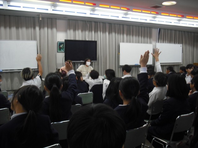 休憩時間中は、林さんが日常生活で使っている、様々なユニバーサルデザインの生活用具を、手に取って確認していました。その後、子どもたちからたくさんの質問をし、心に残ったことなど感想も言いました。「自動販売機は、どうやって買うんですか?」との質問に、「点字がついていても、季節によってちがう商品が入っていることもある。誰かに言葉で言ってほしい」との返答をはじめ、子どもたち、私たちが考えたりできることをたくさん教えてもらった聞き取りになりました。ご家庭でも、「どんなお話やった?」「心に残ったこと教えて?」等など、親子で話し合ってもらえたらと思います。