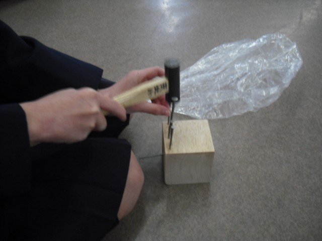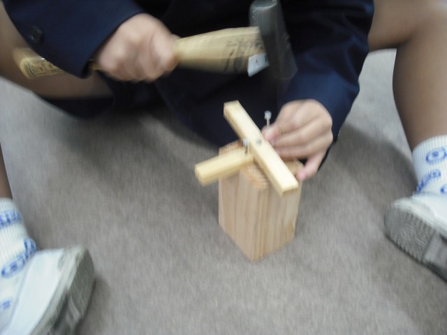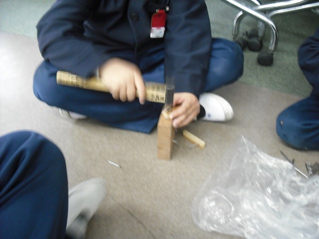 四角い木材、金属の固い釘。この2つの素材から創造力を膨らませて、自分の好きな❝お化け❞を作りました。慣れないトンカチ。思うように刺さらない釘に悪戦苦闘しながら、時には友だちに助けてもらいながら、❝お化け❞づくりに熱中しました。