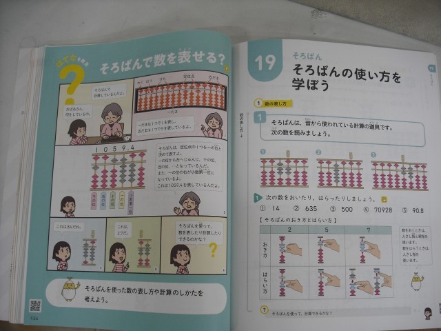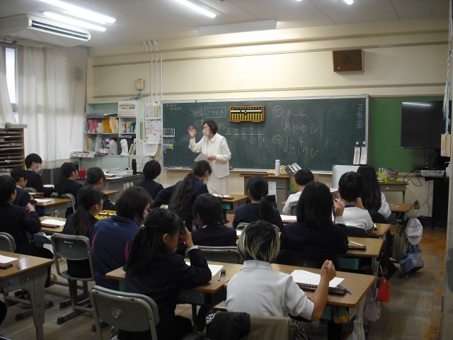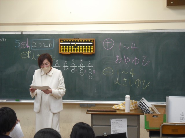 3年生の算数では、「そろばんの使い方を学ぼう」という単元が2時間で設定されています。そこで、市内でそろばん教室を開かれている島原さんに来ていただいて、そろばんの使い方を教えていただきました。基本的な使い方を教えてもらった後、実際にそろばんを使って問題を解きました。たどたどしく指を動かしながらも、そろばんで答えが出ると嬉しそうでした。楽しくそろばんが体験できました。