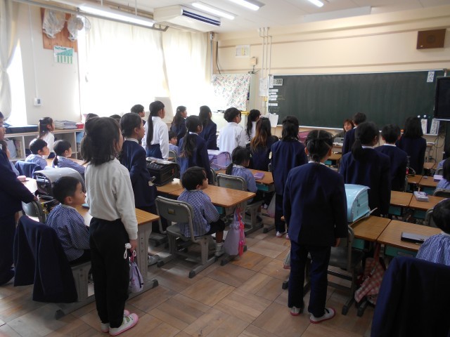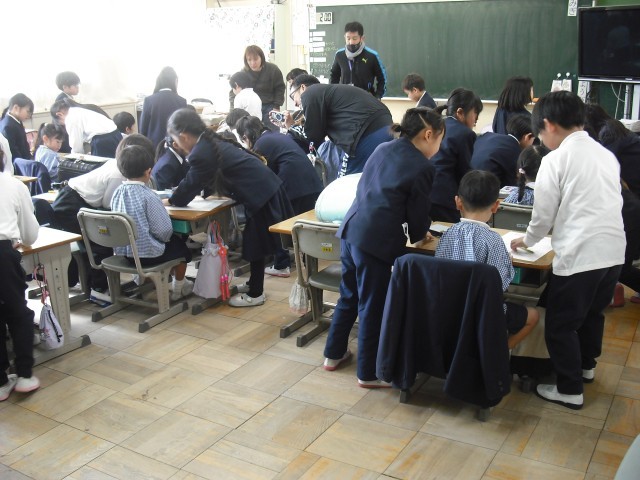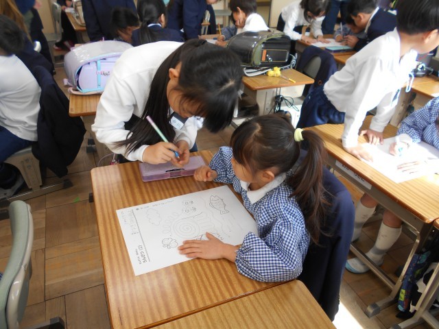 2つのグループに分かれて、1組と2組で1年生の体験をしました。まず、1年生の音読を聞きました。全員が大きな声で、迫力のある音読に、園児は聞き入っていました。1年生も後輩が見に来てくれているからか、とてもやりがいがあるようでした。そのあと、鉛筆で線をなぞったり、色鉛筆で色塗りを体験しました。2人の1年生が手助けして、「どこから書く?」「どこから書いてもいいよ」「めっちゃうまい、6年生ぐらい」等など、とてもやさしい励ましの声を積極的にかけていました。