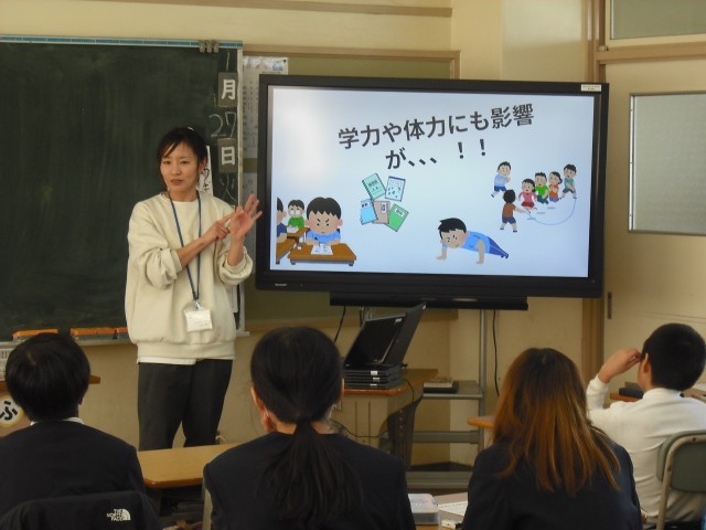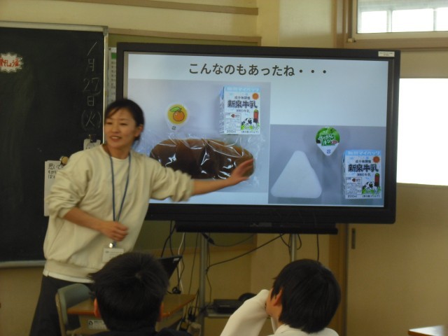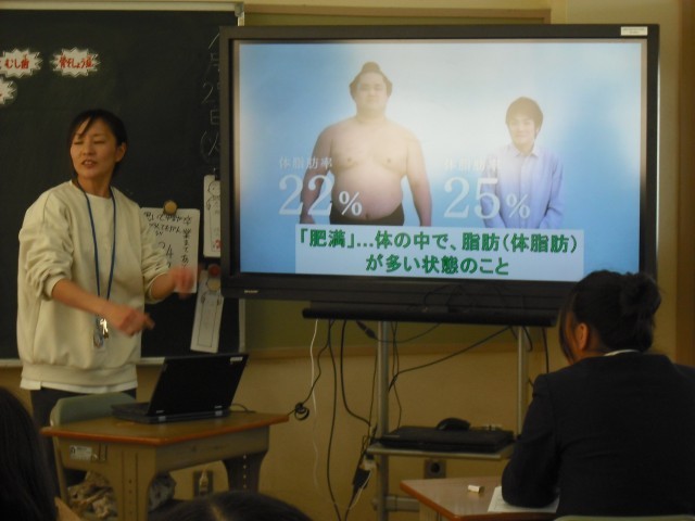6年生は、成長期といって身体(骨格・筋肉・体重)も大きく成長し、心についても大きく揺れ動くこともある大切な時期。だからこそ、しっかり栄養を摂ることが大切です。「朝・昼・晩のご飯で、特に大切なのは?」子どもたちからもすぐに「朝ごはん!」との回答があがりました。朝ごはんは、脳に栄養が行くことで集中力があがり。血行が良くなることで体温も上がる。そして、内臓の働きもよくなり、排便も促される・・・等々、特に大切な食事です。次に、5大栄養素やその役割など、基本的なことを整理しました。そこから、おやつばかり食べたり、体型を気にして食事を摂らなかったりすると、肥満や痩せの問題ばかりか、風邪をひきやすくなったり、糖尿病やがんにもなりやすくなる恐れがあるそうです。バランスの良い食事と運動と睡眠が大切な例として、お相撲さんとそれより少し細身の男性の写真が提示され、「どちらが肥満ですか?」との問いかけがありました。実は、お相撲さんは、体を鍛え睡眠も十分とっているので、意外と体脂肪率が低いことが、この問いかけで分かりました。