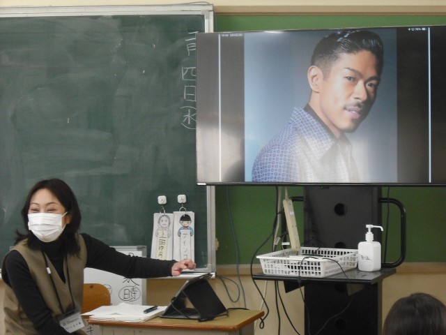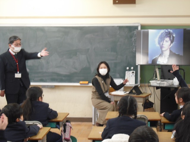 3年生では、障がい理解学習の一環として、大阪府立大阪南視覚支援学校から、村江先生、小北先生に来ていただき、聞き取りをしました。はじめに、3名の方の写真を見せていただきました。「あっテレビで見たことある」「GACKTさん」の声があがりました。先生から「この3人に共通することがあります。それは、何ですか?」と尋ねると、考え込む子どもたち。ヒントとして、「私たち二人は、どんな学校から来ましたか?」と言うと「目の見えない人!」との声。「そうです、3人とも目が見えない、見えにくい人なんです。」お一人目(写真なし)は、吉本の全盲の芸人・濱田祐太郎さん。2人目(写真)は、EXILEのまつさん。3人目(写真)は、GACKTさん。導入から、子どもたちは、今日のテーマ「目が見えない人、見えにくい人について」に引き込まれました。