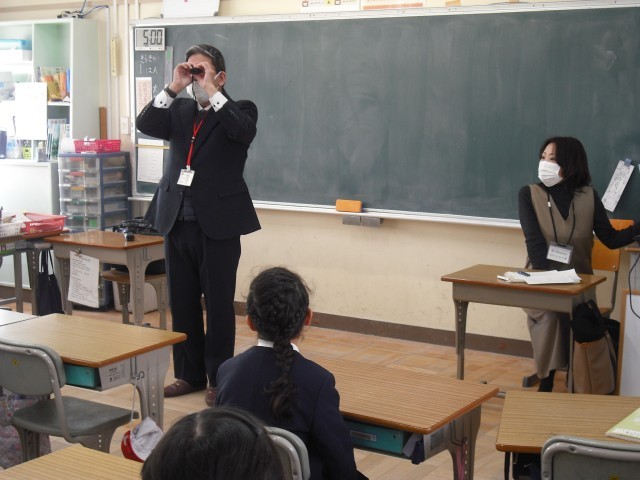 目の見えない人、目が見えにくい人について、学習を深めた後、まとめに入りました。先生から「今から、先生と皆さんで、じゃんけんをします」「今からのじゃんけんは、一つルールがあります。」「目をつぶってじゃんけんします!」。大きな声でじゃんけんが始まりました。「あいこの人と、負けた人は座ってください」負けているのに座らない人がいます。「先生、勝ったか負けたかわからない」「どうしたらわかるかな?」「声を出したらいい」との子どもの声。「目が見ない人は、声を出したらじゃんけんできるね」ということで、もう一度、「じゃんけん、パー(グー・チョキ)」と、目をつぶったじゃんけんをして盛り上がりました。先生から「目が見えないことで、何もできないわけじゃない。工夫するとできることが増える」「皆さんは、これから見えない人、見えにくい人にあったら、どんなことできる?」との問いに、「声をかけてあげる」「服をもってもらって誘導する」・・・との声があがりました。「目の見えない人、目が見えにくい人について」考えることで、これからどんなことができるか考える❝人を思いやる優しい時間❞になりました。大阪府立大阪南視覚支援学校の村江先生、小北先生、ありがとうございました。