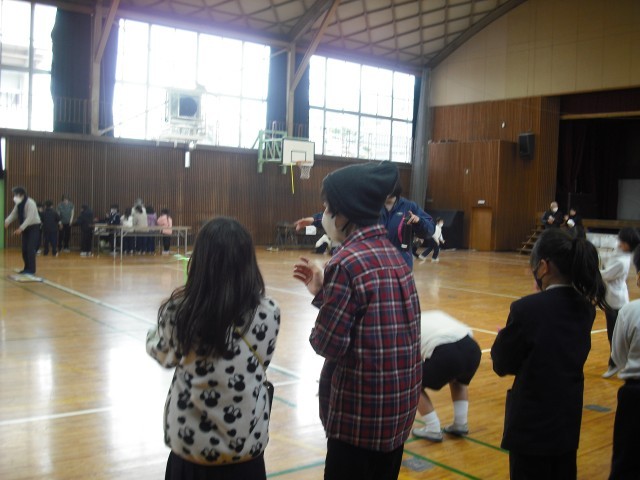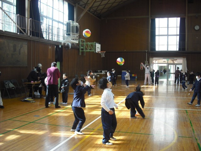 1年生は、弁天苑から代表の長谷川さんをはじめ、19名の方に来ていただき、昔遊びを体験させてもらいました。6つのグループに分かれて、10分ずつにすべてのコースの遊びを体験させてもらいました。写真は、竹とんぼ・お手玉・紙風船の様子です。