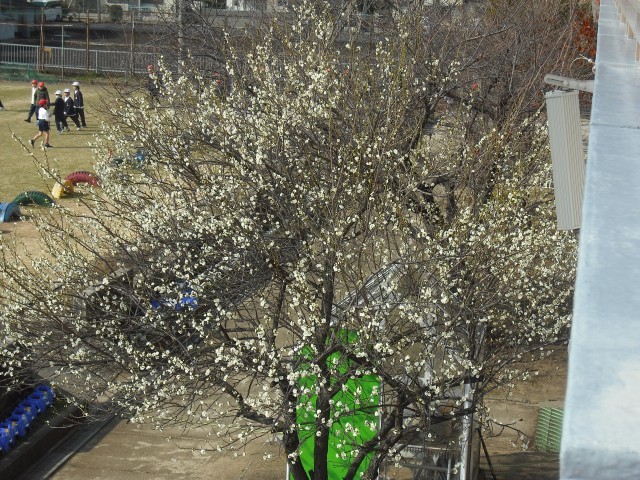 鬼滅の服を着て、鬼から解放する❝お助けマンになる工夫もありました。昨日の雨もすっかり上がった晴天。白梅の花もきれいでした。試合開始の合図が鳴ると、大歓声で大鬼ごっこが始まりました。