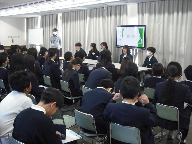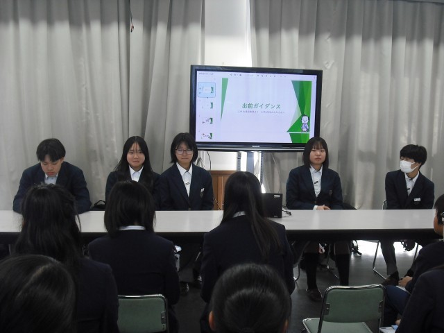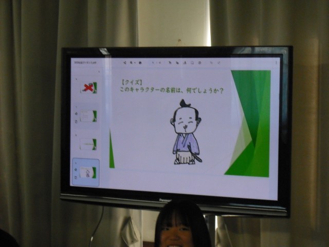 中学校進学を控え、第二中学校の生徒会5名(2年生)が、中学校の学習や生活、クラブ活動等について、また6年生の児童の様々な質問について、お話に来てくれました。写真右から生徒会長の新開さん、体育委員長の船蔵さん、文化委員長の竹中さん、学級院長の齋藤さん、学年代表の近藤さんの5名です。お話の導入は、写真の「この二中のキャラクターは何というでしょう?」との質問からでした。ちなみに❝二中侍❞といい、「誰一人嫌な思いをさせない」二中のシンボルです。(2に続く)