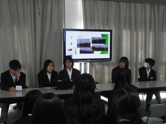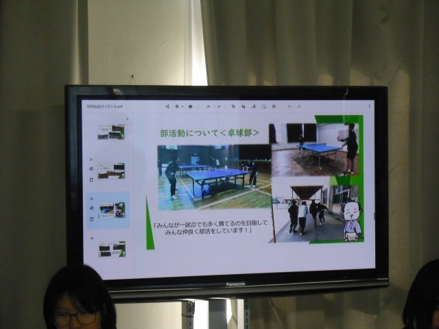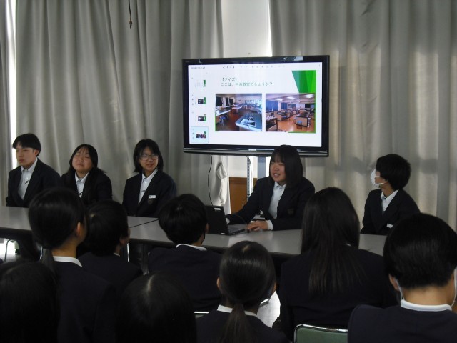 次に、二中の様々な施設や教室の紹介を兼ねた「ここはどこでしょう?」というクイズが出されました。緊張感をほどこう、発言しやすい雰囲気を作ろうとする二中生の配慮が感じられました。その後、二中のテストやクラブ、学校行事や生徒会活動について説明がありました。(3に続く)