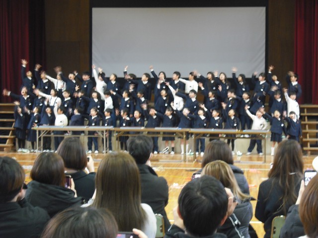 1年生は、この一年の学びと成長について、歌や群読などで、発表しました。はじめに、元気な群読からスタートしました。次に、🎵歌「ゆき」「ドレミのキャンディ」「にじ」の3曲を、振りもつけて披露しました。大きな体育館に小さな1年生の大きな声が響きました。(2)に続く