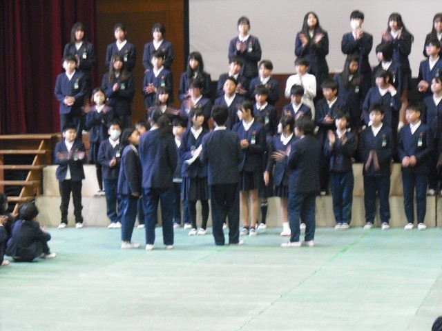 送る会の最後に、6年生が家庭科の時間に作った、配膳台カバーを贈ってもらいました。そして、在校生の拍手の中、6年生が退場しました。下級生からは、拍手とともに、「おめでとう!」「ありがとう!」の声も上がっていました。6年生も含めてみんなで歌った「世界が一つになるまで」のように、6年生を送る暖かな思いで、みんなが「一つ」になった素晴らしい送る会になりました。