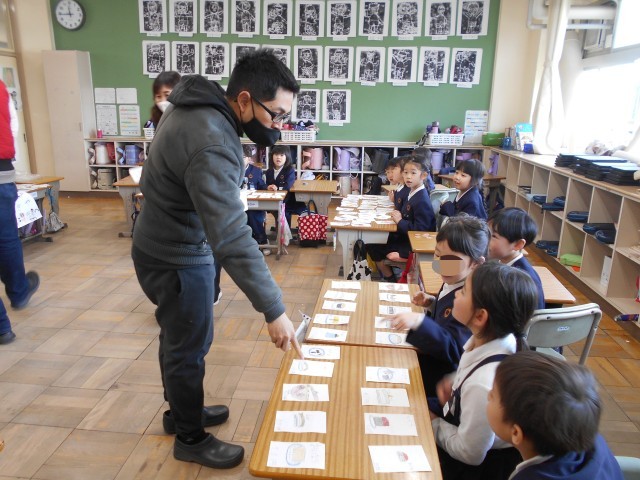 1年生では、国語で「ものの名前」を学んでいます。そこで、算数の計算と合わせて、お店屋さんごっこをしました。様々な商品を作り(紙に商品の絵と名前)、お店屋さんで売り出し、お客さんに商品を買ってもらい、商品の値段を計算して、紙のお金でやり取りしました。教頭先生をはじめとした、教職員に、店員さんたちは、大きな声で自分たちの商品を売っていました。