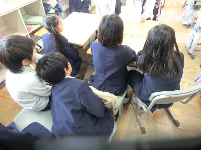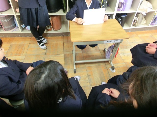 2組に続いて、1組も、5年生がつくった絵本の読み聞かせを行いました。1年生の子どもたちは、5年生の作った絵本を食い入るように聞いていました。