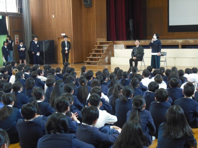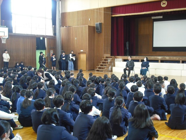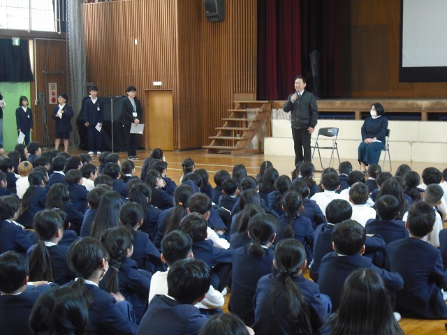 はじめに、教頭先生から見守り隊の方へのお礼の言葉がありました。「天美北小学校の皆さんが、毎日、安全に登校し学習や仲間づくりができているのは、雨の日も風の日も登下校を見守ってくれている見守り隊の方々のおかげです。感謝の気持ちを持って、これからも、元気よくあいさつをしましょう。」との教頭先生からのお話がありました。見守り隊の河内徹様からは、「10年間続けてきました。登下校での事故・ケガがないように、願っている。大きなけがや事故なく、皆様が成長するのを楽しみにしている。」、河内美代様からは、「春休みも元気に過ごしてもらって、4月の新学期に元気な姿に会えるのを楽しみにしている」との挨拶をいただきました。