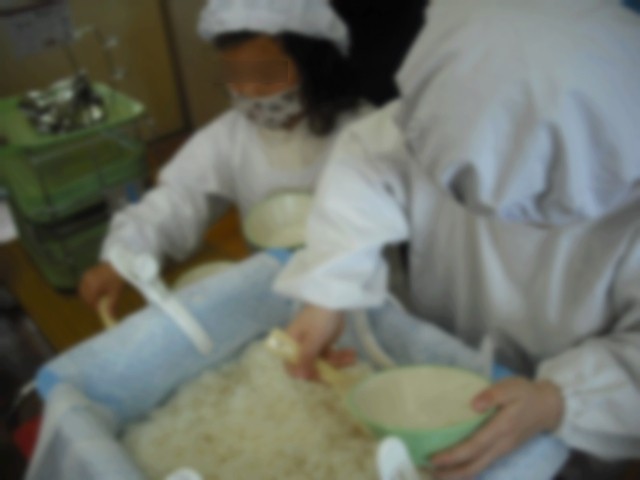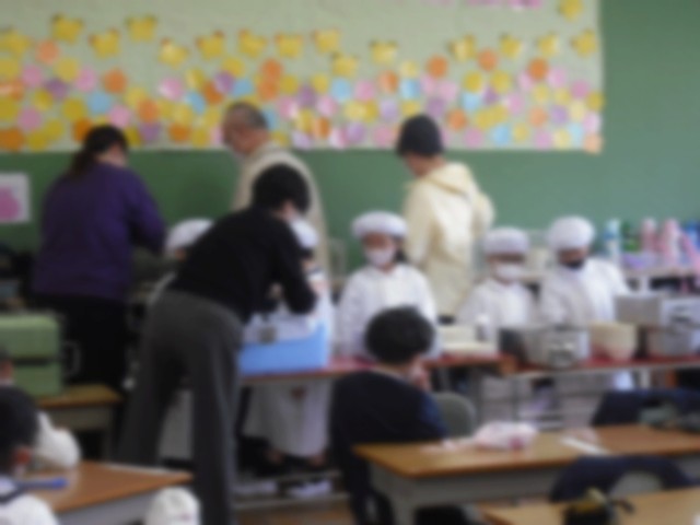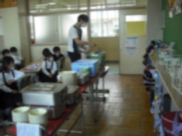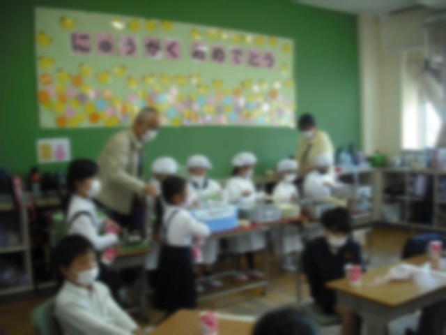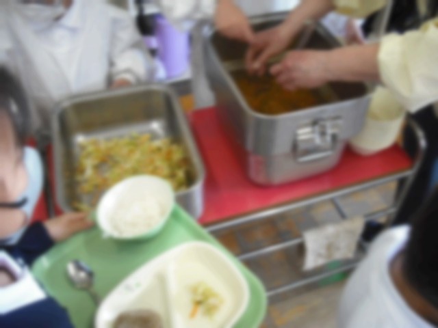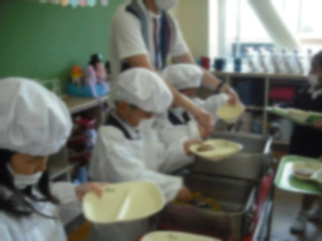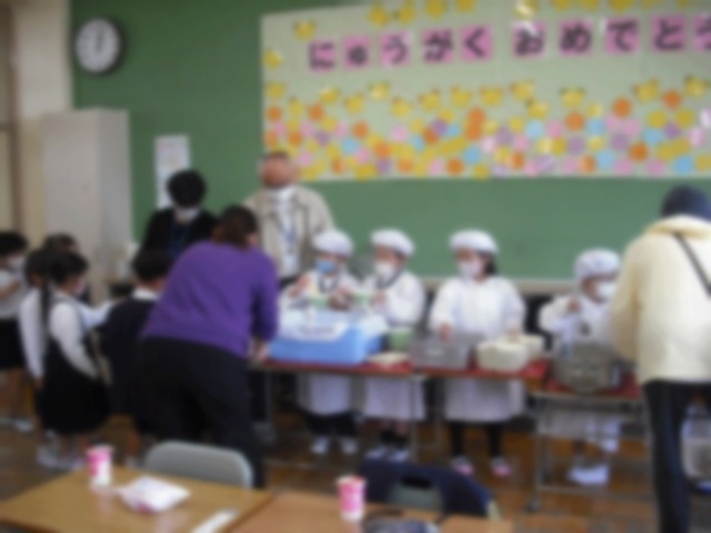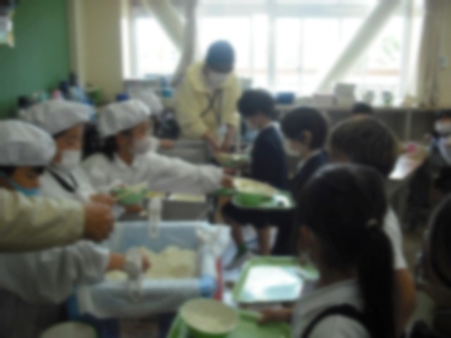 今日から1年生の給食が始まりました。たくさんの先生たちがサポートにきて、子どもたちと一緒に配膳をしました。最初は、戸惑っていましたが、一椀入れるごとに上手になっていて吸収力の早さに驚きでした(^^)/
