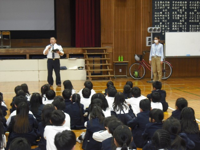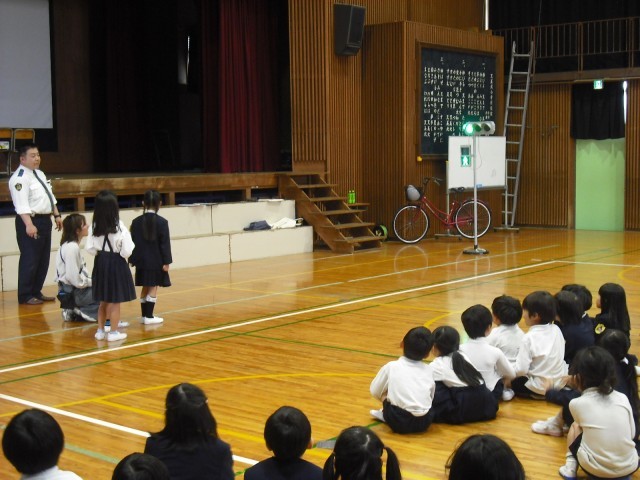 本日3時間目、交通安全教室を実施しました。松原警察より宮下さん、松原市役所より高橋さんに来ていただき、楽しく交通ルールや交通事故から、命を守る方法を教えてもらいました。自転車事故が多いので、ヘルメットを着用すること、横断歩道のわたり方について指導してもらいました。信号無視の車もいるので、青信号になっても、すぐに渡らず、「右・左・右」を確認すること、「とまる・みる・まつ」ことの大切さを教えてもらいました。後半は、ビデオで楽しく、交通安全について学びました。
