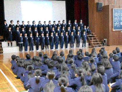 6年生は、11月28日の児童朝会で「100羽のつる」の物語を朗読しました。絵本の絵が後ろの画面一杯に映し出され、静かな音楽の中、6年生の一人ひとりの声が響きました。しっとりとした声で、病気の小さなつるが、落ちていく場面、そこから99羽が一斉に団結して助けに落ち始めた緊迫の場面、最後は助け出されるという安堵した場面、感動の物語でした。1年生から音読タイムで練習して6年間積み上げてきた成果を見せてくれました。