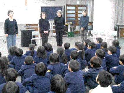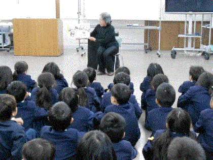 1・2・3年生は、12月2日(金)に、読み聞かせ会をしていただきました。1年生は、絵本「よるのさかなやさん」「かいけつトイレざむらい」「きつねをつれて」、紙芝居「おけやのてんのぼり」、お話「アナンシと五」です。2年生は、絵本「バナナのはなし」「もりでいちばんつよいのは」「かいけつトイレざむらい」、紙芝居「ほたかのきょうだいぐま」、お話「アナンシと五」です。3年生は、絵本「かあさんのおめん」「ひぐまのあき」、紙芝居「どんぐりとやまねこ」、お話「ネコの家に行った女の子」「かしこいおいしゃのめぐすり」です。読み聞かせ会は、2時限目から4時限目まで一学年ずつだったので、読んで下さる方々は大変だったと思いますが、子どもたちは、とてもうれしそうに聞き入っていました。ありがとうございました。