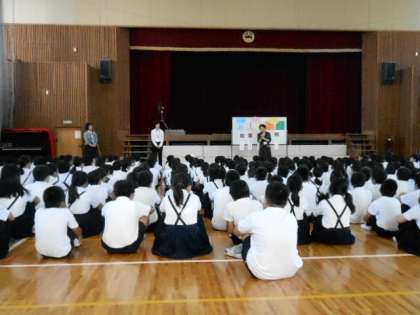 まず、校長の話は、短縮期間中の過ごし方の確認で、一番暑い時間帯は、涼しい所で宿題・自由学習・読書などをしようということと、2学期に向けて、「あ・ま・み・き・た」の合言葉の確認、そして「ひらめき・ときめき・きらめき」で頑張ろうということと、「お・い・あ・く・ま」を自分から追い出して、みんがキラキラ輝いていこうという話でした。
