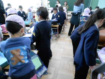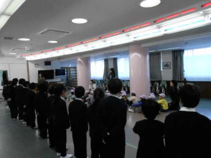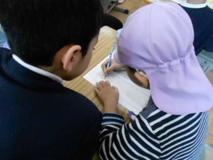 来年度、天美北小学校の新一年生になる子がいる第四保育所の年長さんが、来てくれました。1年生からいろいろな話をしながら、えんぴつの書き方を教えてあげたり、おひなさまを作るのを手伝ってあげたりしました。とてもやさしく教えていました。