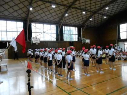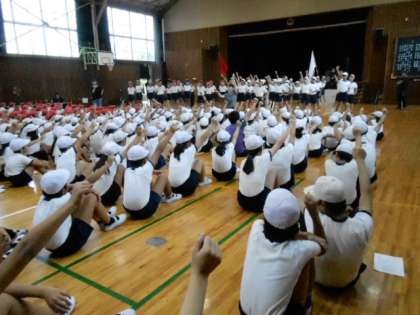 9月18日(水)の全体練習では、応援団を中心に、運動会で行う応援練習をしました。赤白組に分かれて、一拍子、二拍子、三拍子、三三七拍子、フレーフレー拍子、エール交換を太鼓に合わせて練習しました。応援団長の大きな張りのある声が、体育館に響き渡っていました。運動場でも、大きな声が出るように練習していきます。