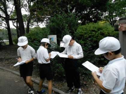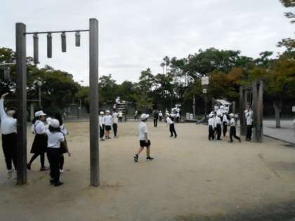 10月24日(木)、朝、雨は止み、3年生は、長居公園の遠足に出かけました。近鉄電車で矢田駅まで行き、歩いて長居公園へ着きました。雨雲の様子で、予定を大幅に変更し、最初に班ごとにグルーンアドベンチャーをしました。20個の木々の名前をあてていくクイズです。植物園を半周する位の大掛かりな物でした。その後、弁当を食べました。大きな木の下で食べていたので、少しの雨だったのですが、気になりながらもおいしいお弁当を食べ、おやつも食べ、少し自由遊びもしました。その後、博物館をゆっくりと見て回りました。昼時だったので大変すいていました。残念ながら、雨はやみそうにもなかったので、早い時間の電車に乗って帰ってきました。学校で振り返りをして、残りの時間を体育館で遊んで帰りました。