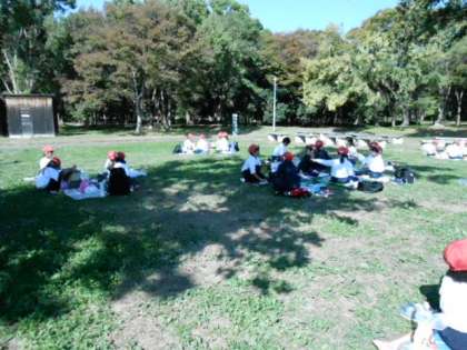 1年生は、延期になった遠足を11月6日(水)に実施しました。青空のきれいな秋晴れの一日でした。近鉄電車で河内天美駅から布忍駅まで乗り、そこから大泉緑地まで歩きました。どんぐりや松ぼっくりを探しながら、芝生広場まで行き、お弁当とおやつを食べました。最後に遊具のある広場で楽しく遊んで帰ってきました。たくさん歩きましたが、どんぐりなどのおみやげがあって、これから、何をつくるのかワクワクしているようです。