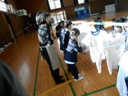 12月23日(月)に、1年生は、保護者の方々に協力してもらいながら、お家の仕事を体験しました。そうじ機かけ・洗濯ものほし、洗濯ものたたみ、包丁で野菜切りをしました。包丁のコーナーでは、お家の方々に手をそえてもらって切る練習をしていました。これが、冬休み期間中に、お家でのお手伝いにつながればいいと思います。