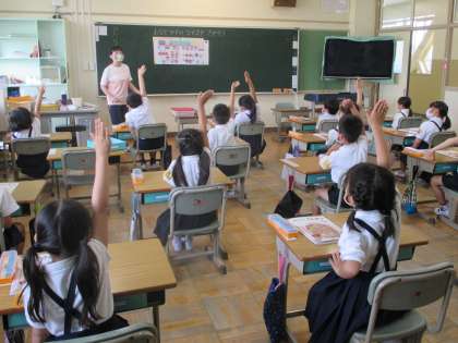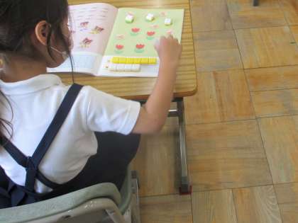 1年生は、算数のタイルを並べて学習中です。 わかったら手を挙げて・・・しっかり発表できました。