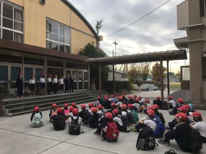 4年生の遠足は、関西サイクルスポーツセンターでした。遠足実行委員が中心となって進めていました。写真は出発式の様子です。