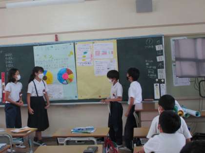社会で食糧生産について学び、調べたことを国語で学んだ発表の工夫を取り入れて、グループごとに発表しました。