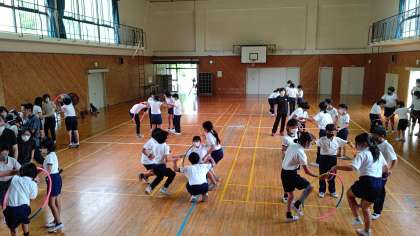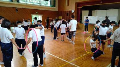 午後のチームビルディングスタート 公開日 2022/07/21 更新日 2022/07/21 5年 午後のチームビルディングが始まりました。最初はフラフープを使って、フープまわしをしました。手を離さずにどうしたら早く1周回るか、いろいろ話し合いながら試していました。