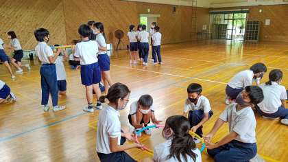 続いて「フラフープおろし」 公開日 2022/07/21 更新日 2022/07/21 5年 班のみんなの指はフラフープにそえるだけ。みんなの胸の高さから床まで、1人も指を離さずにおろせるかを試します。これもみんなの声かけが必要です! "1人はみんなのために、みんなは1人のために"