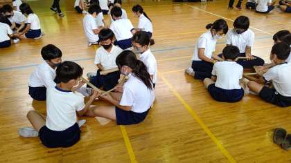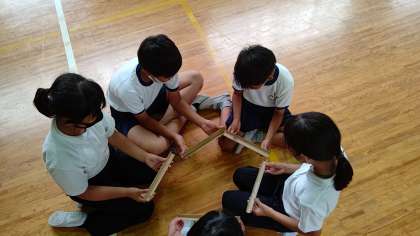 ビー玉回し 2分で何回回るかな? 公開日 2022/07/21 更新日 2022/07/21 5年 筒を半分にしたもので、ビー玉を落とさないようにうまく隣の人に回していきます。1回目より2回目の方が記録がのびた班がほとんどでした!チームワーク力がすごい!