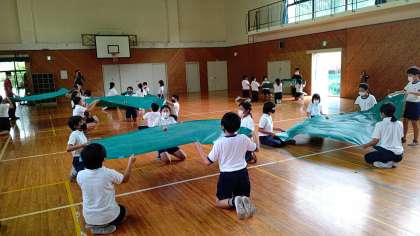 最後のアクティビティ「リフティング」 公開日 2022/07/21 更新日 2022/07/21 5年 緑のシートの上で、小さいボールを息を合わせて弾ませます。これもどの班も声をかけあっていてチームワーク力が高まっていきます!